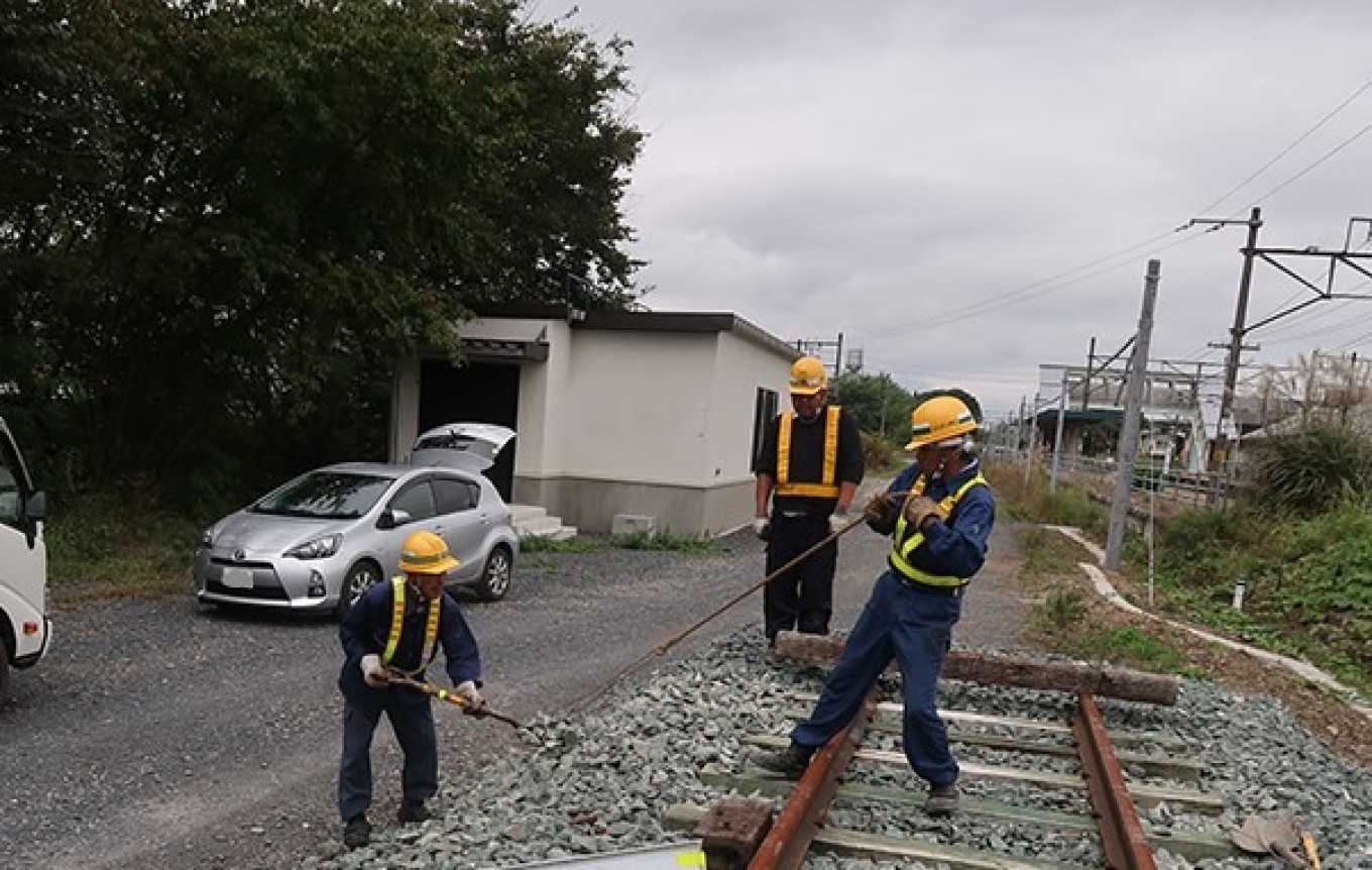 重機を使ってのマクラギ交換などがある一方で、縄スコを使って地面をならす作業など、まだ人の技術が必要な場面も多いです。